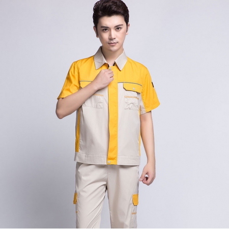 苏州鹰诺服装:深蓝配桔红短袖工作服AD069