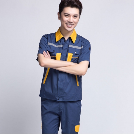 苏州鹰诺服装:深蓝配桔红短袖工作服AD069