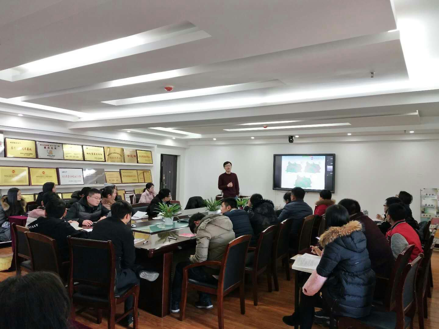 培训会上,董教授就遥感技术的基本原理以及在农业、环境、地矿、规划等领域的应用进展情况做了介绍,重点讲解了遥感技术应用于农业病虫害监测、产量预测以及地理信息技术应用于环境污染源普查的具体案例。培训后期,公司测绘地理信息一部及环境事业部的员工向董教授介绍了公司的基本情况及业务开展的现状,就相关案例及技术应用进行了提问,并就校企合作的相关事宜进行了探讨,董教授对公司员工在相关业务开展过程中的困惑进行了解答并给出了具体的指导意见和建议。