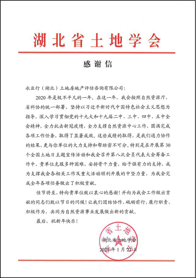 2020年是极不平凡的一年,在这一年里,永业行全力抗击新冠疫情,积极配合湖北省土地学会各项工作,助力自然资源事业发展,受到湖北省土地学会的积极肯定,于2021年1月收到湖北省土地学会发来的感谢信。
