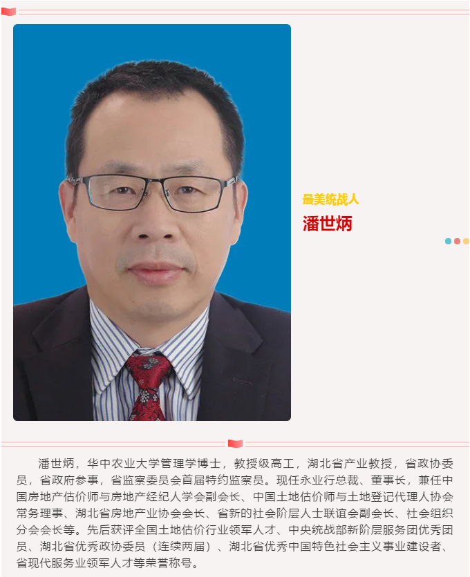 潘世炳对统战工作的认识,缘于一次培训。2007年9月,潘世炳作为武汉评估行业唯一的博士和教授级高工,受邀参加“武汉市2007年自由择业知识分子培训班”。此次培训进一步拓宽了他的视野,坚定了跟党走的信念。在组织的关怀下,2008年,潘世炳荣幸地担任了湖北省政协委员,成为社会科学界代表人士。 担任政协委员以来,他积极参加各类视察、调研、考察活动,利用专业知识和基层视角持续建言献策,撰写提案、建议50余项、大会书面发言和联组发言20余次,为推动相关产业发展提供了有价值的参考和依据。多份提案获主办部门高度评价,其中《关于疫情对我省房地产行业产生的影响及相关措施的建议》被采纳至《促进建筑业平稳健康发展的措施》(鄂政办发〔2020〕13号)中。