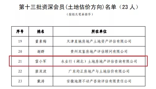 2021年12月23日, 中国土地估价师与土地登记代理人协会(下称“中估协”)发布“2022年度A级资信土地评估中介机构”名单,在全国120家A级资信机构中,永业行位列全国第四、湖北第一,连续14年获评“A级资信土地评估机构”。中估协同时公布了第十三批资深会员名单,副总裁雷小军荣获土地估价方向资深会员荣誉。