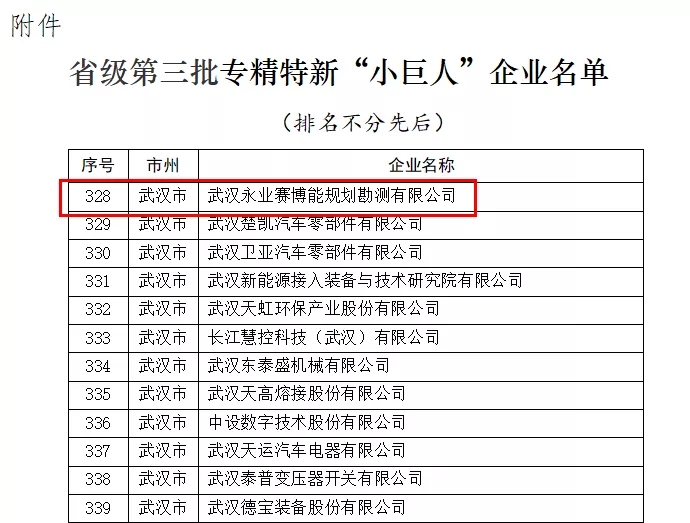 近日,湖北省经信厅公布了2021年第三批专精特新“小巨人”企业名单。通过申报和评审,永业行咨询评估集团旗下武汉永业赛博能规划勘测有限公司(下称“永业赛博能”)荣登榜单!