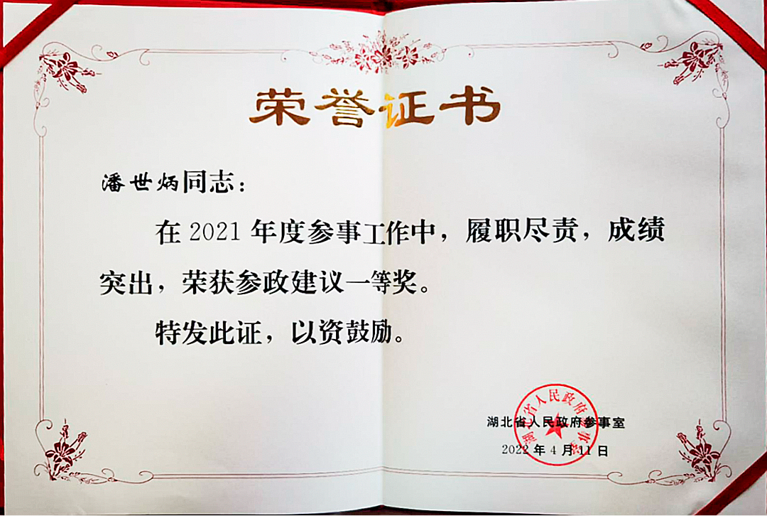 近日,湖北省人民政府参事室发文,对2021年度先进参事和参事工作单项奖获奖参事进行通报表彰,省政府参事、永业行董事长潘世炳荣获先进参事、参政建议一等奖。
