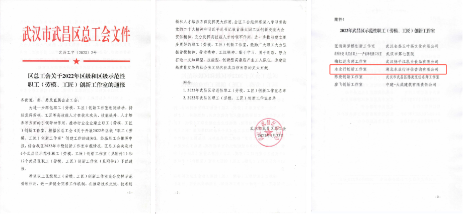 近日,武汉市武昌区总工会发布《区总工会关于2022年区级和区级示范性职工(劳模、工匠)创新工作室的通报》(武昌工字〔2023〕2号),永业行获评“2022年武昌区示范性职工(劳模、工匠)创新工作室”。
