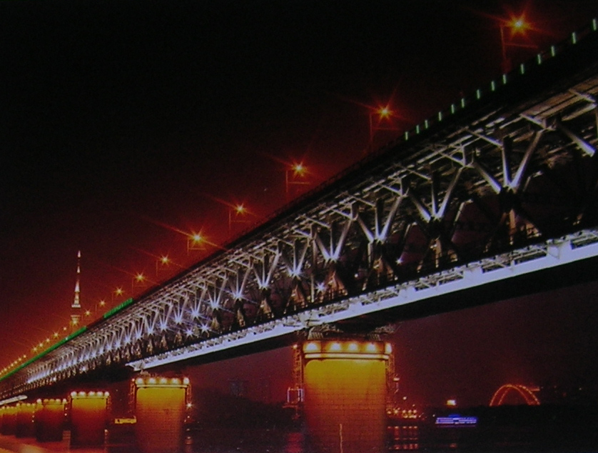 今年为庆祝建国60周年,武汉市政府重新用景观灯装饰了长江大桥等标志建筑。《国庆夜色中的武汉长江大桥》这一永业行是刘晓峰总经理于国庆节前夕、华灯初上时在大桥下拍摄的。灯火璀灿的长江大桥象征着我们祖国正走向繁荣昌盛的明天。