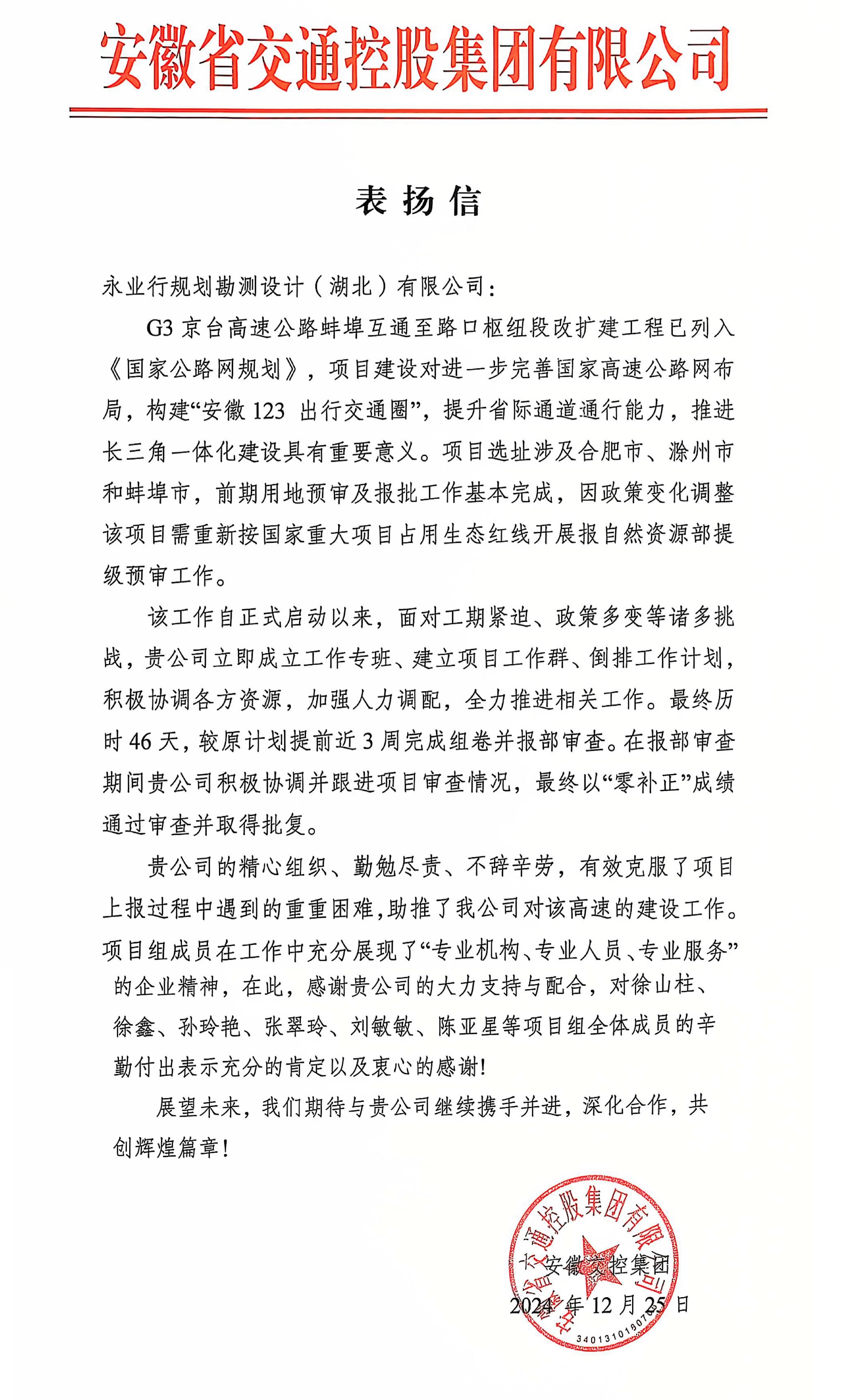 感谢信称,G3京台高速公路蚌埠互通至路口枢纽段改扩建工程已列入《国家公路网规划》,项目建设对进一步完善国家高速公路网布局,构建“安徽123出行交通圈”,提升省际通道通行能力,推进长三角一体化建设具有重要意义。自永业行承接项目提级预审以来,面对工期紧迫、政策多变等诸多挑战,项目组成员(徐山柱、徐鑫、孙玲艳、张翠玲、刘敏敏、陈亚星、章磊、韩琴、房吴宇、赵勇)展现了高度的专业精神和职业素养,通过对新政策、新规则的精准把控,合理分解任务,有效解决问题,最终历时46天,较原计划提前近3周完成组卷并报部审查,以“零补正”通过审批,获得业主好评。