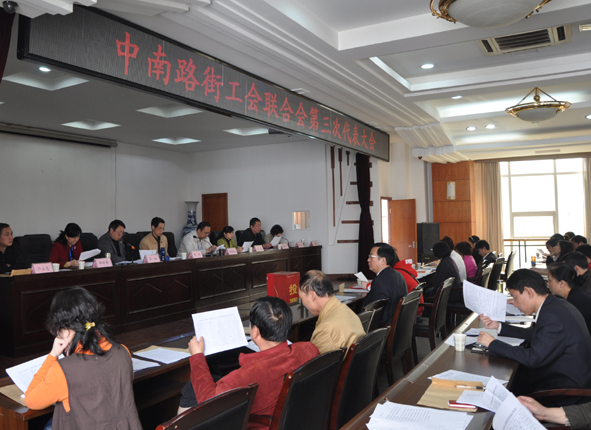 出席本次大会的领导有:武昌区总工会常务副主席周训、副主席杨霞、组织部长严必忠;中南路街工委书记葛文凯,副书记、纪委书记罗林,副书记孙娅莉,办事处副主任何文娟、人武部部长阮武兴等。会议由中南路街人武部部长阮武兴主持。罗林副书记在会上作了工作报告并对未来五年工会工作进行了展望;会议审议通过了《武昌区中南路街工会联合会章程》(修正案)和《武昌区中南路街工会联合会第三次代表大会选举办法》,并选举产生了第三届常务委员会委员。