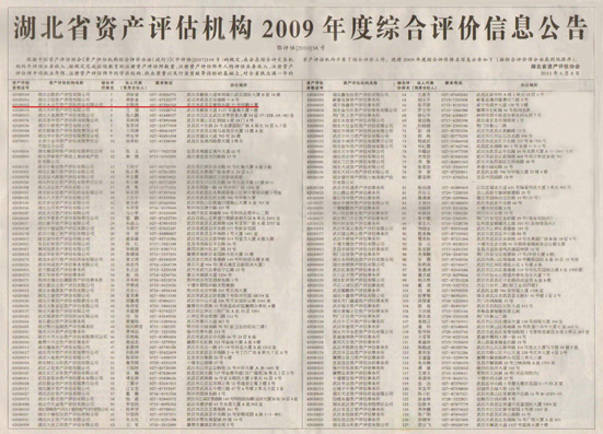 在6月8日公布的湖北省资产评估机构2009年度综合评价排名信息中,湖北永业行资产评估咨询有限公司(以下简称“永业行资产评估公司”)位居第三,排名较2008年度上升了两位。