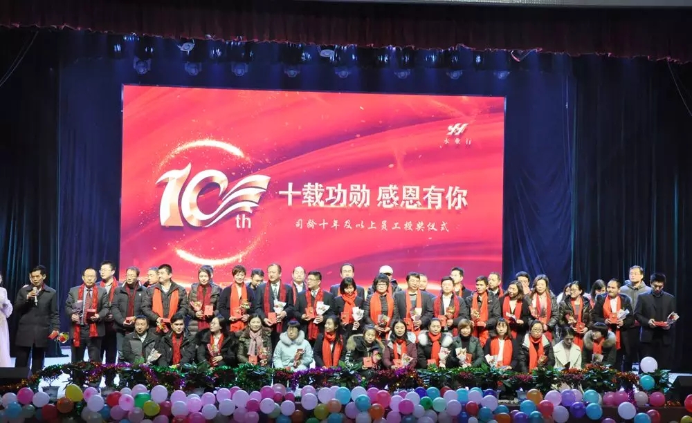 永业行成长至今,离不开一直默默付出的员工们。本次年会将走心进行到底,特别设置了“十载功勋 感恩有你”环节。凝聚永业行人心声的视频短片《十年芳华 不忘初心》,让现场观众无限感动、一度哽咽。59名十年及以上的员工依次登台,董事长方国成、总裁潘世炳为各位老员工颁发了十年勋章及鲜花,希望他们能与永业行挽手同行,再创辉煌。