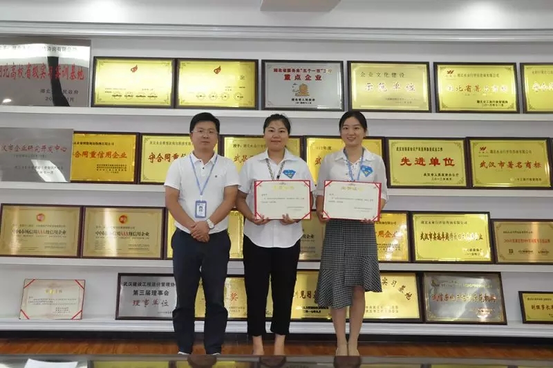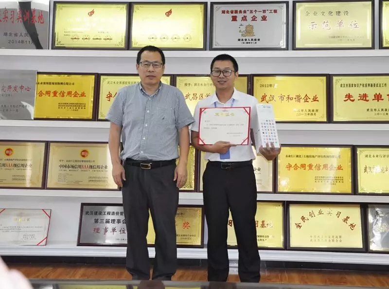永业行副总裁刘晓峰为三等奖获得者测绘地理信息一部孔书敏、国土研究事业部廖广宇、鄂东区袁鑫颁奖
