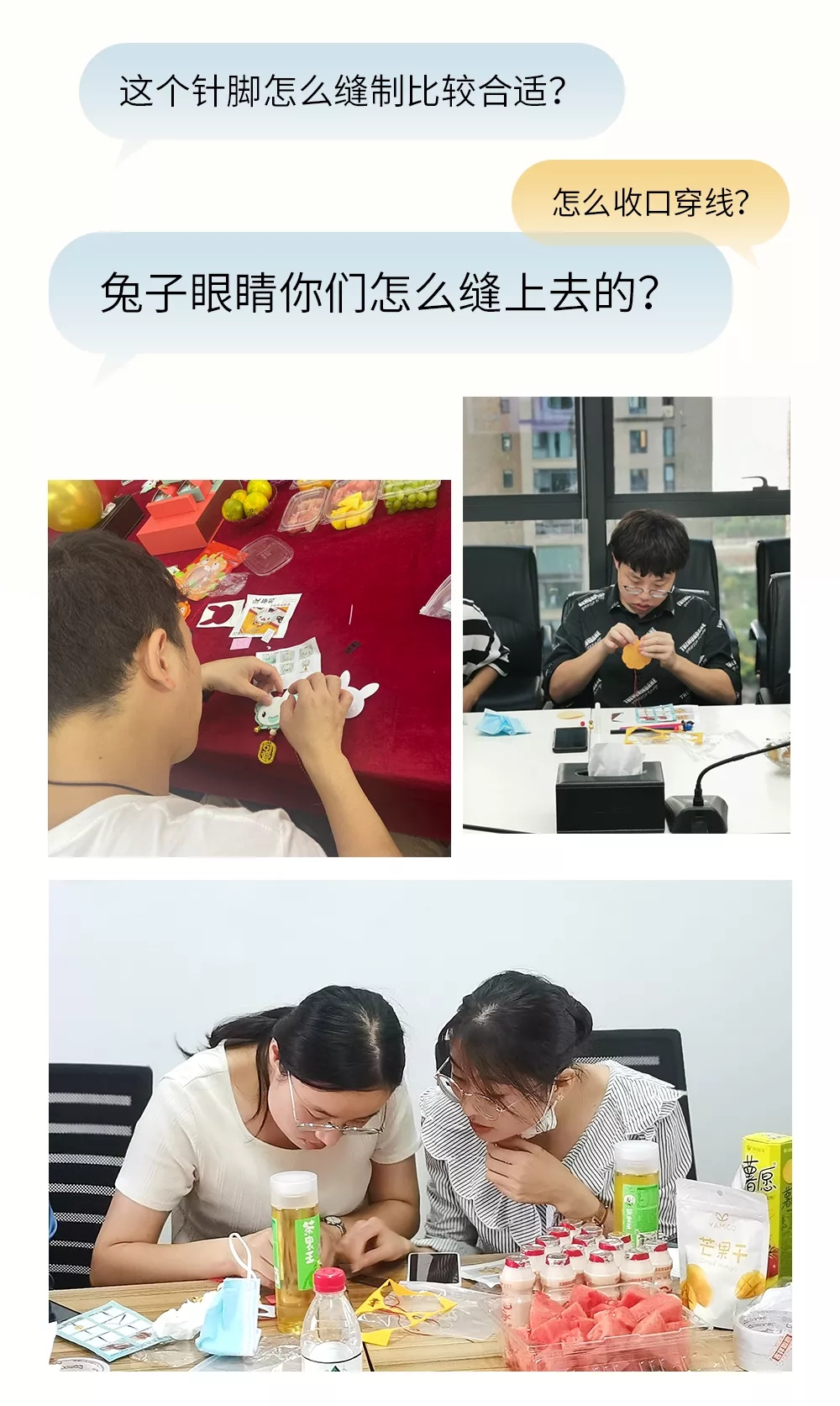 在热烈的讨论中,大家互相指导帮忙,按照步骤有条不紊地进行折布、缝边、填充……随着一双双巧手上下翻舞,一个个精巧别致、趣味十足的香囊呈现在大家手上,细密针脚蕴含着心意,缕缕幽香寄托着祝福。