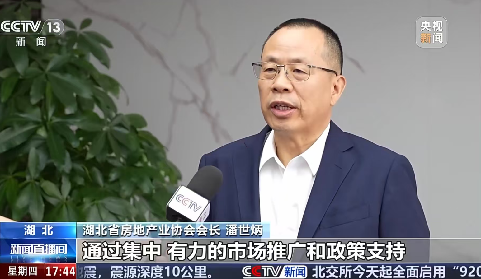 2025年10月9日,中央电视台《新闻直播间》栏目播出“湖北多地举行房交会 楼市呈企稳回升势头”报道,湖北省房地产业协会会长、永业行董事长潘世炳接受央视记者采访。