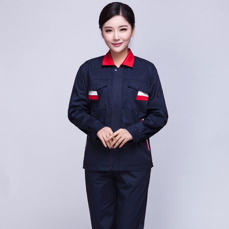 苏州鹰诺服装:藏青拼米色涤棉线卡哈尔滨工作服AC090-QX