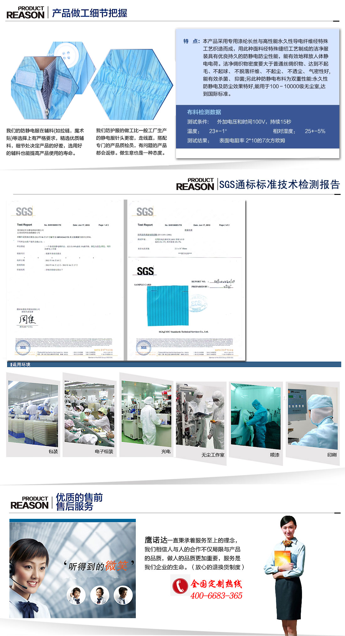 【品名】:防静电连体服 可选连体[上衣+下衣连体]和四连体[帽子+上衣+下衣+鞋子],以及分体三种款式