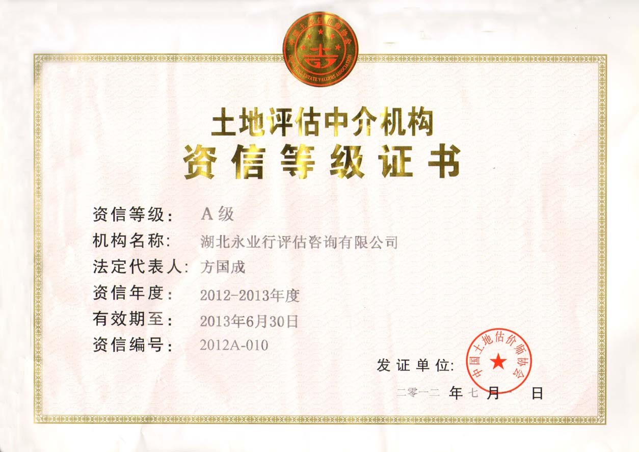 近日,永业行被评为2012-2013年度A级资信土地评估机构