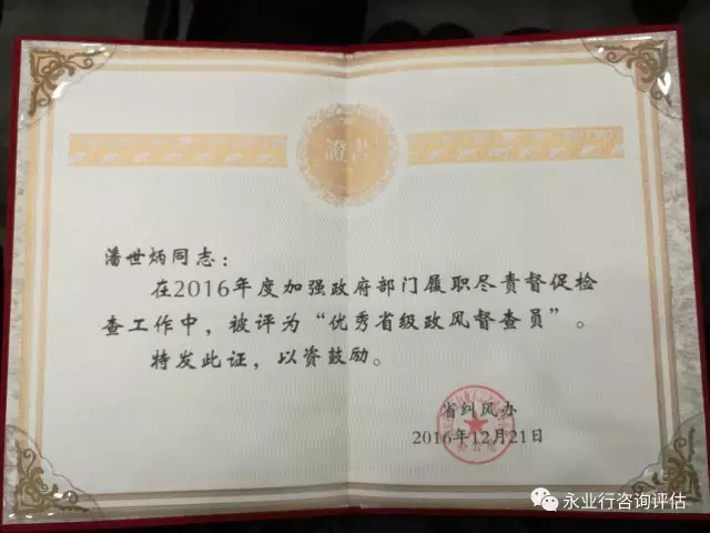 2016年12月21日,潘世炳获评优秀省级政风督查员