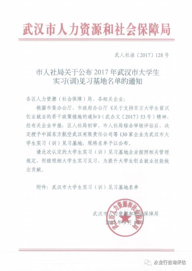 经武汉市人力资源和社会保障局新一轮综合审核评估,2017年9月19日,永业行再次被授予“武汉市大学生实习(训)见习基地”。