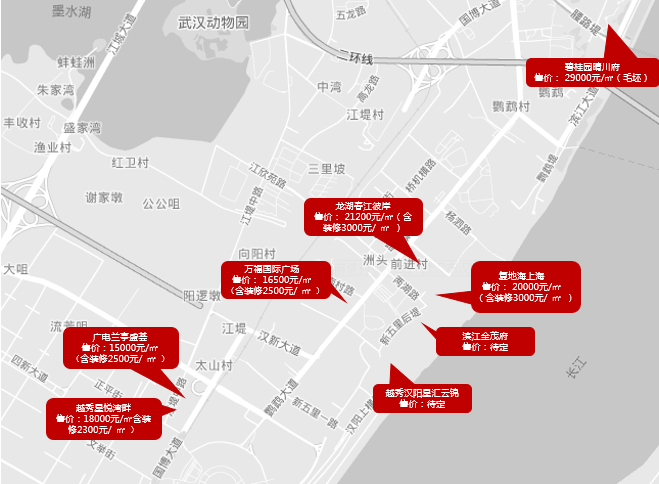 汉阳滨江区域房价为15000元/㎡-29000元/㎡,从入市产品分析,汉阳滨江区域大部分楼盘均以精装修入市, 精装修价格为2300-3000元/㎡。