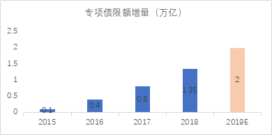做一个简单测算模型,从需求端来看,棚改资金主要取决于棚改项目的落地进度,根据2018-2020年将改造各类棚户区1500万套,2018年完成580万套以上,初步预计2019年改造460万套,按照开工套数和投资规模测算,明年棚改项目投资近  1.3万亿元,则政策行和专项债两项需要覆盖90%即为1.17万亿。供给端分析,专项债积极政策支持下,结合往年专项债限额变动趋势,预计2019年地方政府专项债限额保底新增2万亿,考虑到存量专项债的发行结构中土储、棚改、收费公路三者比例构成(6:3:1;如图9),预计2019年棚改专项债将会新增6000亿的额度。供需两端相结合,政府购买模式取消,仅依靠专项债融资,预计2019年棚改项目资金缺口会达到6000亿元。