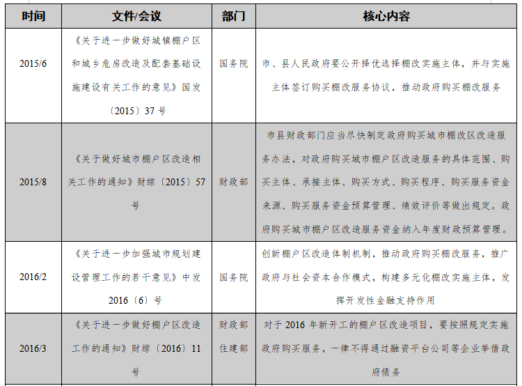 回顾棚改之政策,真正涉及政府购买服务的棚改类政策始于2015年,国发〔2015〕37号作为纲领性文件,为棚户区改造开拓了新的举债融资渠道,即地方可与承接主体签订政府购买协议推动棚改进程。伴随经济下行压力以及严峻的去库存形式,棚改作为稳增长、保民生的重要支撑,却在监管体系边缘游离。