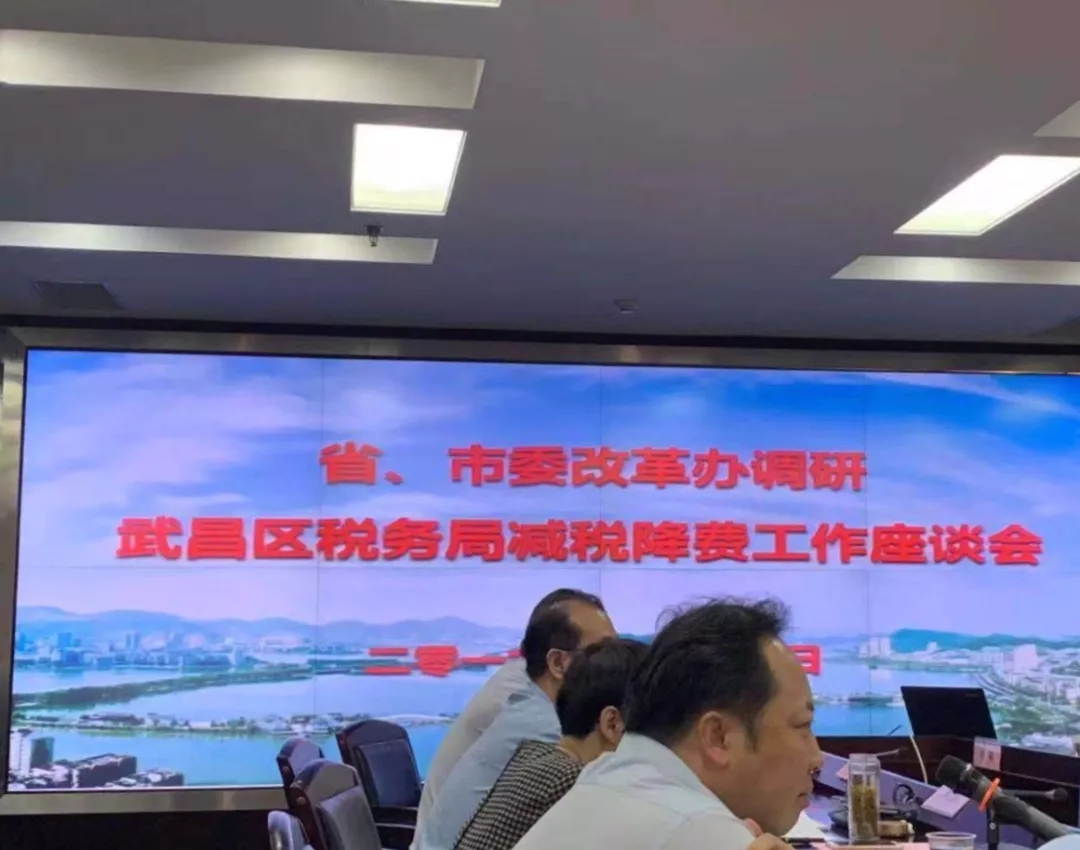 近日,省、市委改革办调研减税降费工作座谈会在武昌区税务局召开,省委改革办专职副主任江国志、市委改革办(政研室、财经办)副主任刘永明、武汉市税务局党委副书记兼副局长肖才茂、武昌区税务局党委书记兼局长张毅平等领导出席会议,武昌区税务局科级以上干部,永业行、铁四院等3家纳税企业代表参加了本次座谈会。