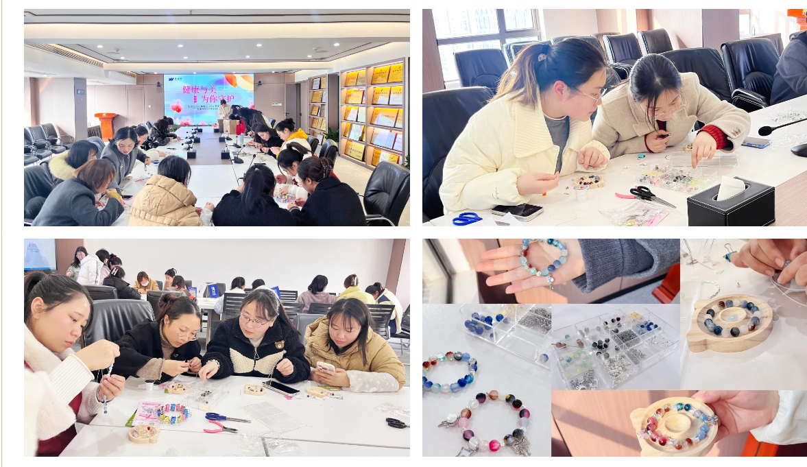 公益讲座结束后,迎来了令人期待的串珠DIY活动。活动现场提前准备好了各式各样的花样琉璃珠、精美小巧的饰品、线材及各式制作工具。随后,大家在小伙伴的指导下“飞珠走线”。温润剔透的珠子,犹如一颗颗小小星球,穿过莹白细腻的丝线,在大家的巧手下被一一赋予了生命,仿佛平行存在的独立宇宙。花漾时光,有“妳”真好。串一链春天,愿“珠”事顺意,生活如春,步步生花,自由绽放。